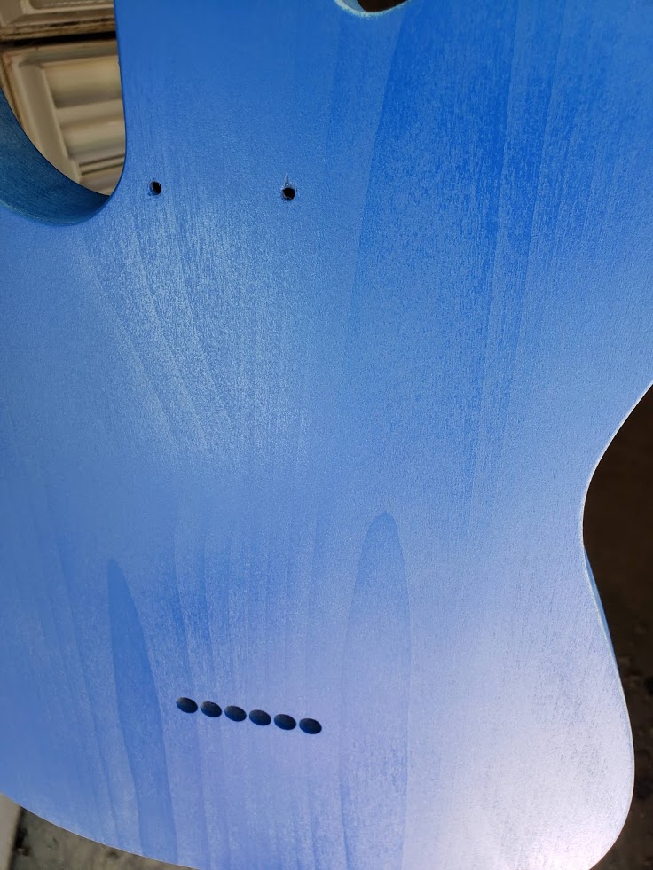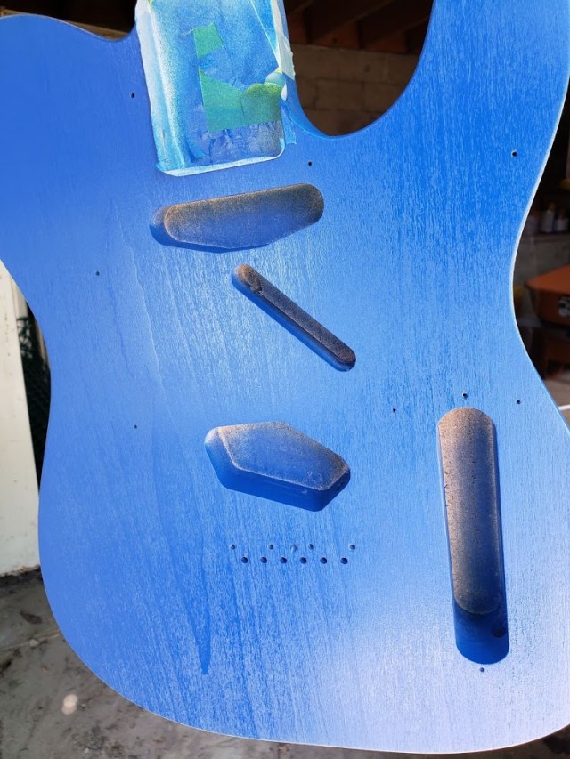 My cousin suggested that I wet-sand without the soap, but cautioned that the soap is likely embedded in the dried paint at this point. So, I sanded the body back down to the wood last fall, and I’m applying paint with a brush. It does not look as good, but I make much quicker progress this way.